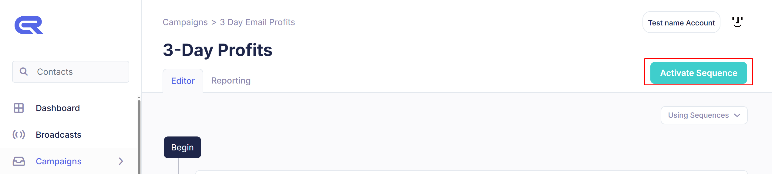To enable the sequence, simply click the Activate Sequence button on the top right of the screen. If you need to navigate back to this screen later to activate it, you can find it by going to Campaigns > All My Campaigns, clicking your Sequences number, and selecting the sequence name.