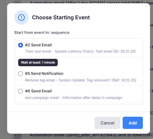 Select which event in the sequence the contact should start from. You'll see a list of available events (e.g., Send Email, Add Tag) along with any wait times between them. Choose your desired starting point and click Add.