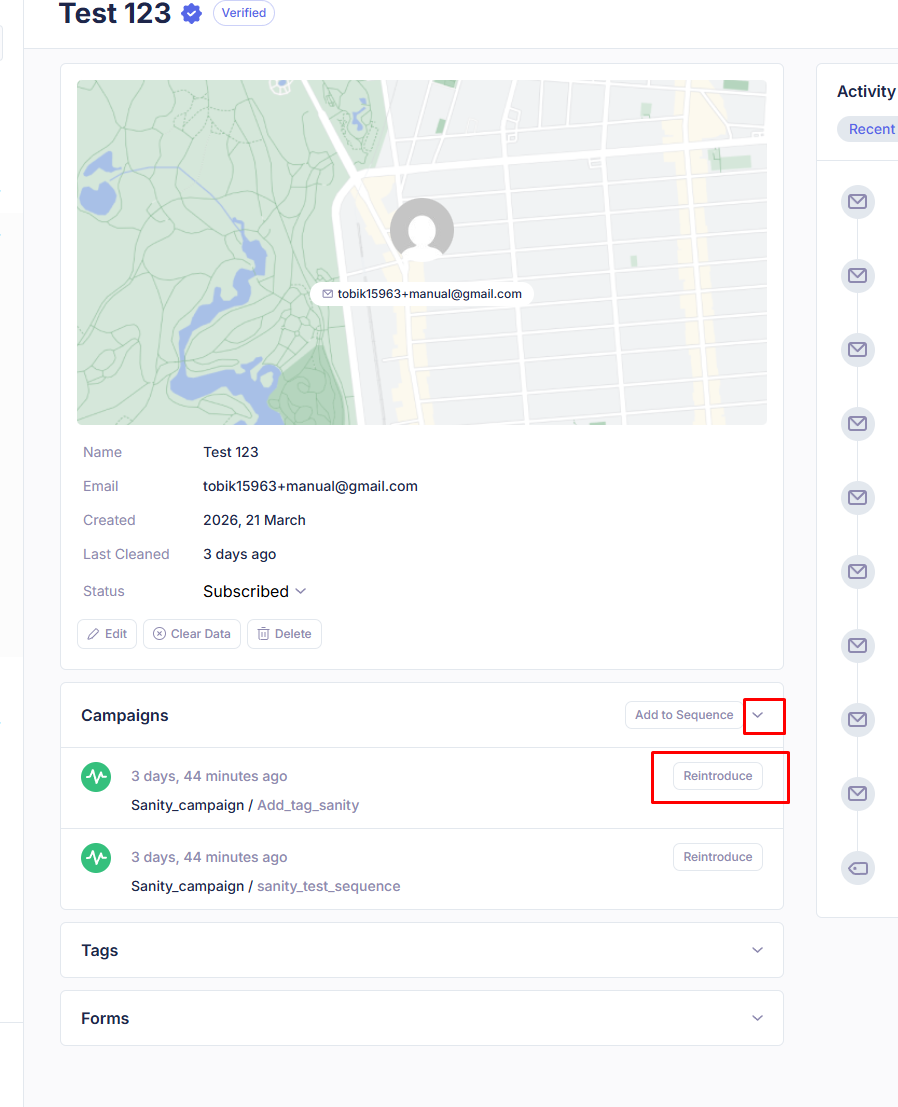 Manage which sequence a contact is on within a campaign. Use Add to Sequence to enroll a contact in a new campaign sequence, or use Reintroduce to restart a contact from a different point in a sequence they're already subscribed to.