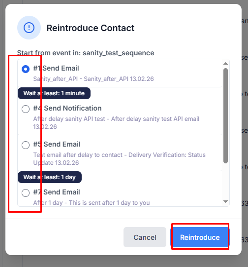Once you've selected the starting event, click the Reintroduce button to confirm. The system will immediately cancel all pending jobs and reschedule the contact starting from your selected event.